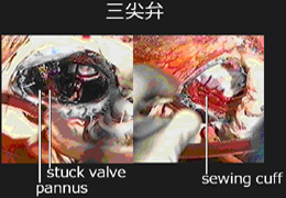 右上図左側は機械弁にパンヌス(内膜組織などが異常増殖したもの)ができて一回目の心臓手術から23年目に再手術になった患者さんの写真です。白い矢印がパンヌスを示します。右上図の右側は機械弁を取り外したあと、人工弁の下側にもパンヌスができていたのを示します。いずれもきれいに切除し、新たな機械弁を入れて、弁も患者さんも元気になられました。